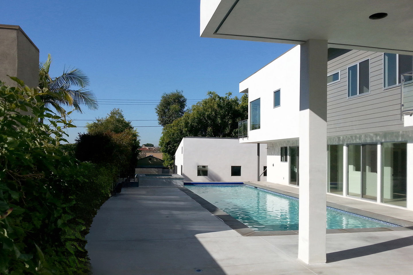 An L-plan, hinged together with a dramatic 2-story light tower, allows a view of the pool from all spaces in this new 2,800sf westside residence. The front volume features the living, dining, and family room. The side volume features the kitchen, den, and guest suite, with 3 bedroom suites on the second floor.